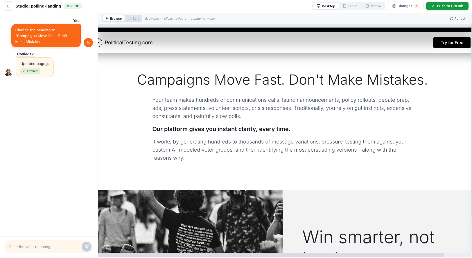 CodieDev Studio is a visual interface that lets your non-engineering team push real code changes, no tickets, no meetings, no waiting. Chat with AI, see the result live, and open a PR in minutes.
